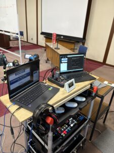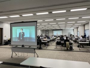 ・オンライン越しのパネリストの御姿や画面共有は、サブPCからHDMI等を介してプロジェクターに投影(この際、サブPCは必ずミュートし、PC音量も0にする。たまにプロジェクターのスピーカーを認識してハウリングを起こしたりするのでセッティング時に注意)