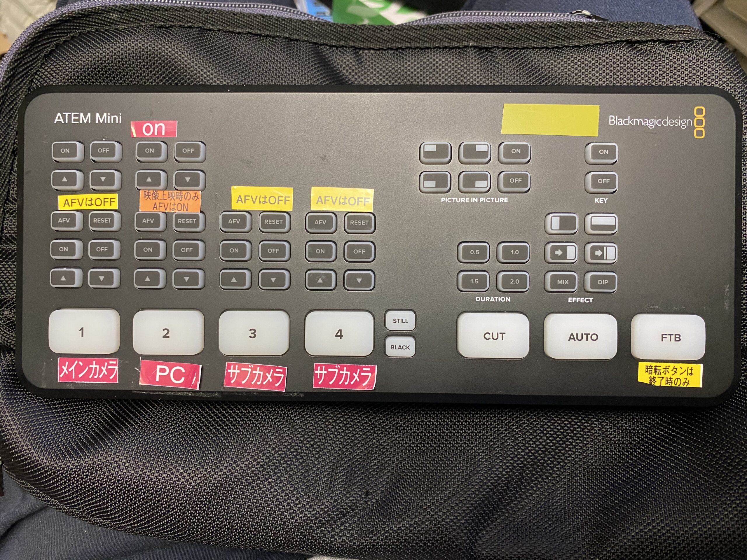 ・会場内登壇者のスライドは、アイキャッチ画像にあるATEM(ビデオスイッチャー)のHDMI出力からプロジェクターに投影